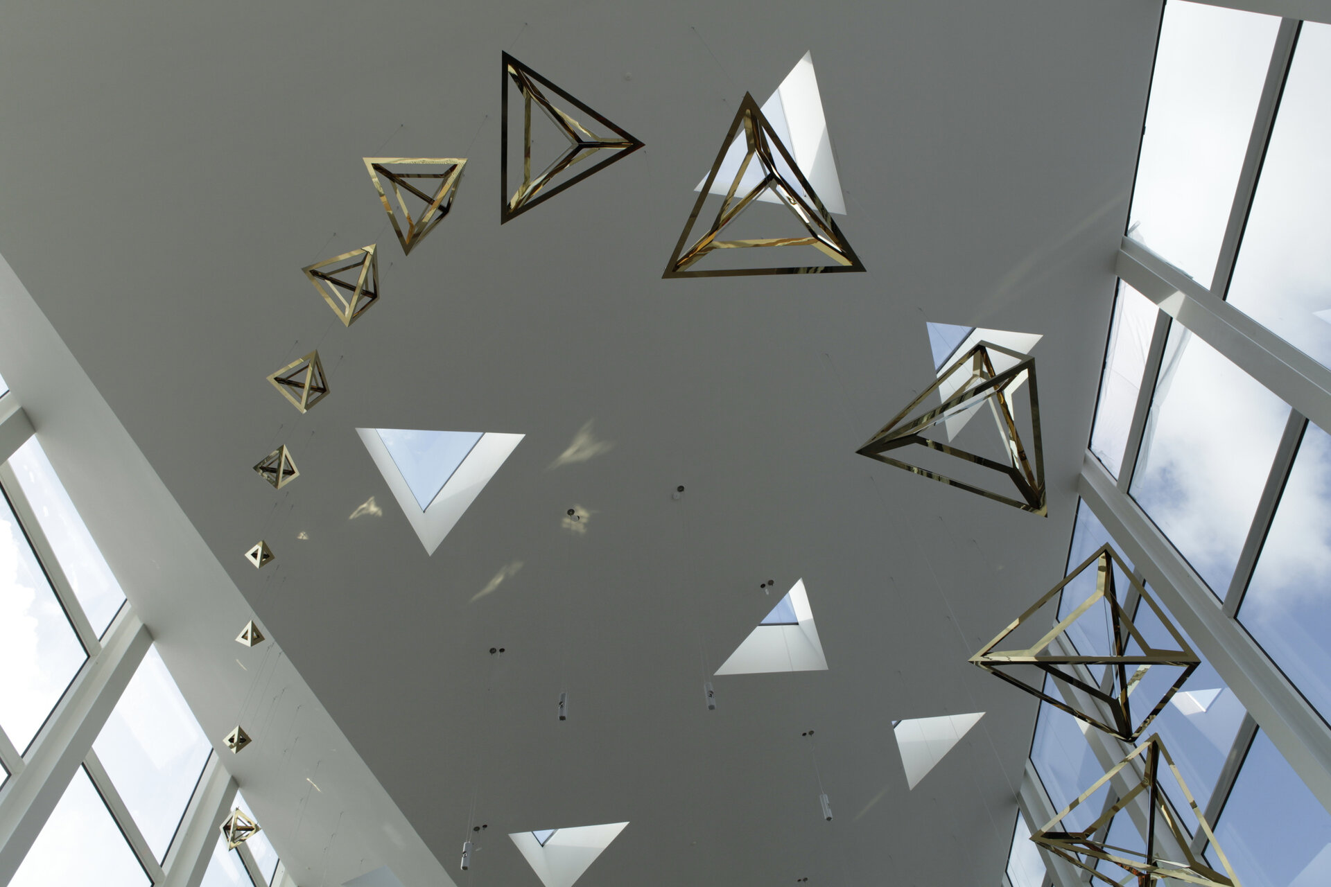 36 individually suspended tetrahedra, arranged along a Möbius strip, hang in the atrium as a welcome arch for the Rødovre Centrum. Sunlight creates dynamic shadows and reflections across the group, which change with time and seasons. The tetrahedral forms trace the single-sided loop of a Möbius strip — a continuous path with no inside or outside. Part of the "Art in Architecture" program, the installation is a welcome element at the shopping center entrance. An LED system illuminates the structure and responds to the existing architecture and daylight.