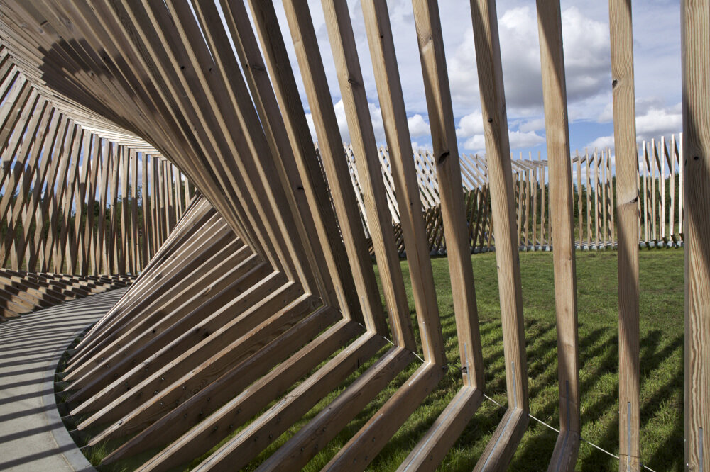 An interactive sound installation in Hjallerup, Denmark: a computer-controlled audio system inside wooden frame structures. Sound and spatial layout are coupled so that visitor position and movement affect what is heard. The geometry of the frames and the placement of speakers and sensors define the acoustic field and the zones of response. The work is site-specific; the layout was designed for the Hjallerup context.