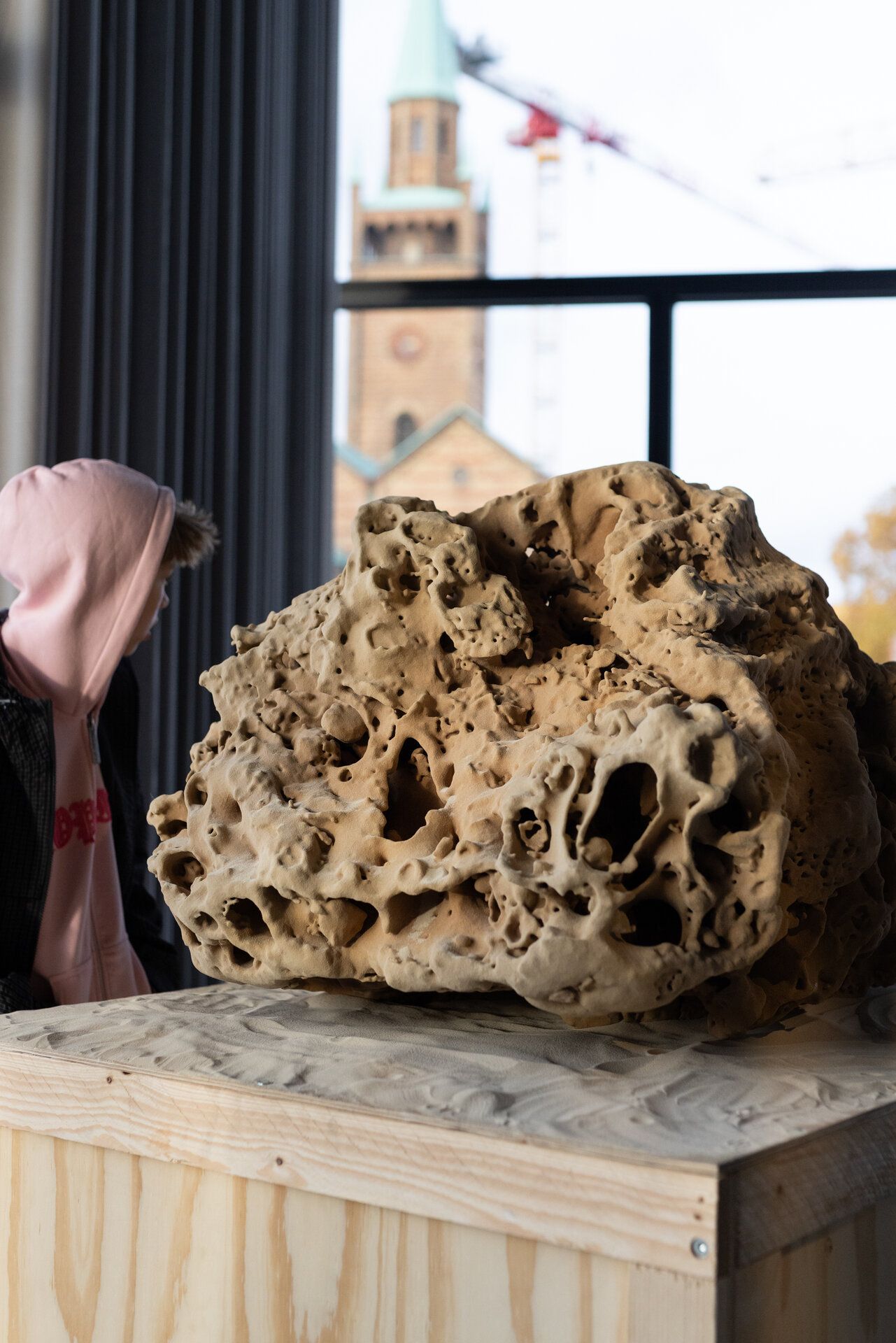 "Fragment-Proximity_Sa-Ràpita_23-41" presents a single sand grain from Mallorca's Sa Ràpita coast, part of a global collection spanning coastal locations worldwide. The sculpture shows this grain enlarged approximately 1000 times through nano-CT scanning and 3D printing in sand. What normally remains invisible becomes a tactile surface — microscopic geological detail at monumental scale. The work addresses sand's paradox: metaphor for infinity yet disappearing resource. Global consumption reaches 50 billion tonnes annually while angular particles suitable for construction grow scarce. Desert sand, rounded smooth by wind, remains structurally useless despite vast quantities. The grain from Sa Ràpita carries traces of Mediterranean geology — stone fragments, shell particles, mineral compositions shaped by coastal processes. Each surface feature records erosion patterns, transport histories, temporal forces operating beyond human perception. Presented at Festival of Future Nows 2025 — the third edition returning to Neue Nationalgalerie after inaugural 2014 and 2017 iterations — the sculpture sits among 100 international artistic positions spanning performances, installations, and participatory works. The sand grain grounds abstract resource crisis in material specificity: planetary boundaries made tangible through geological evidence.