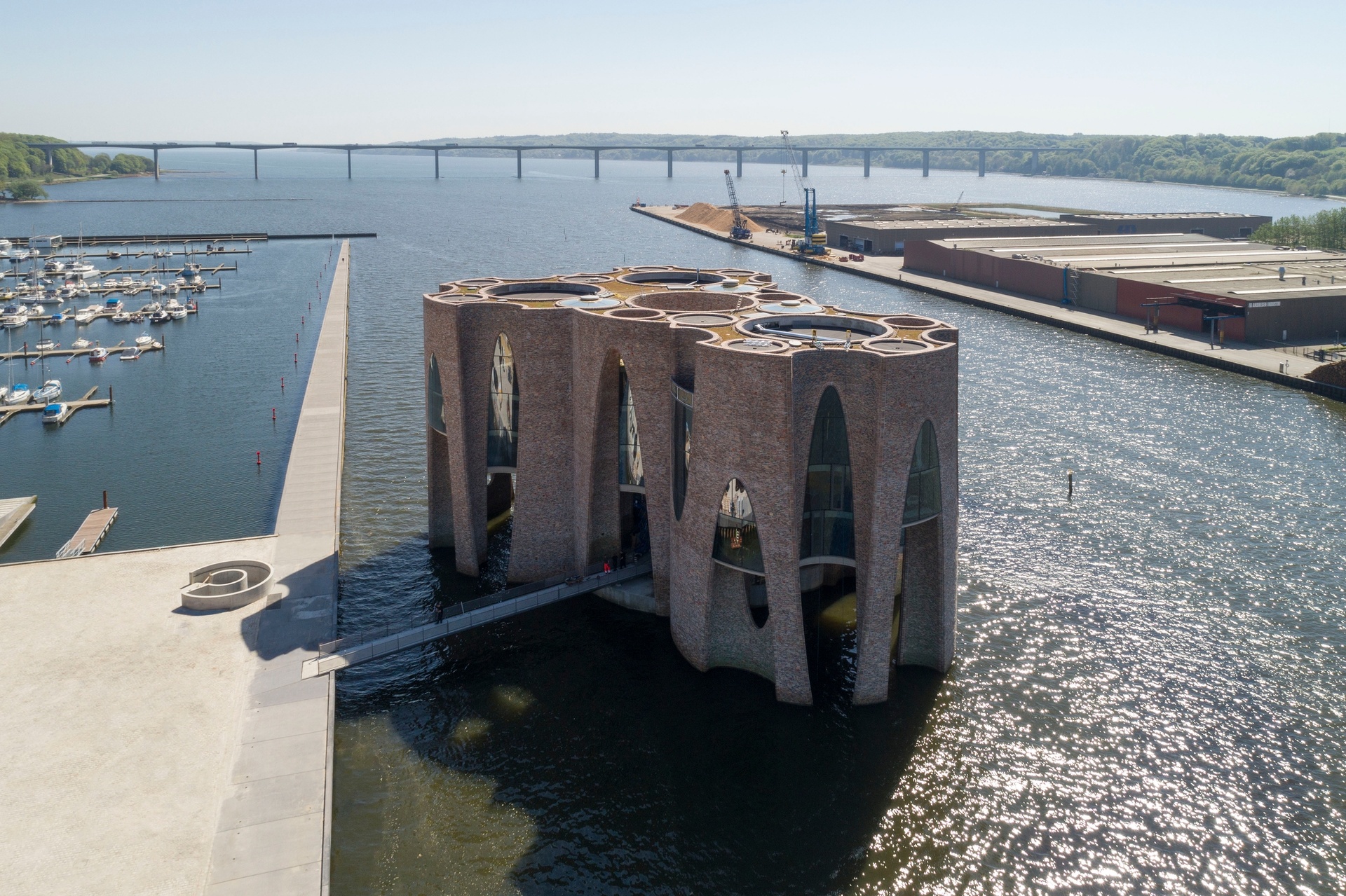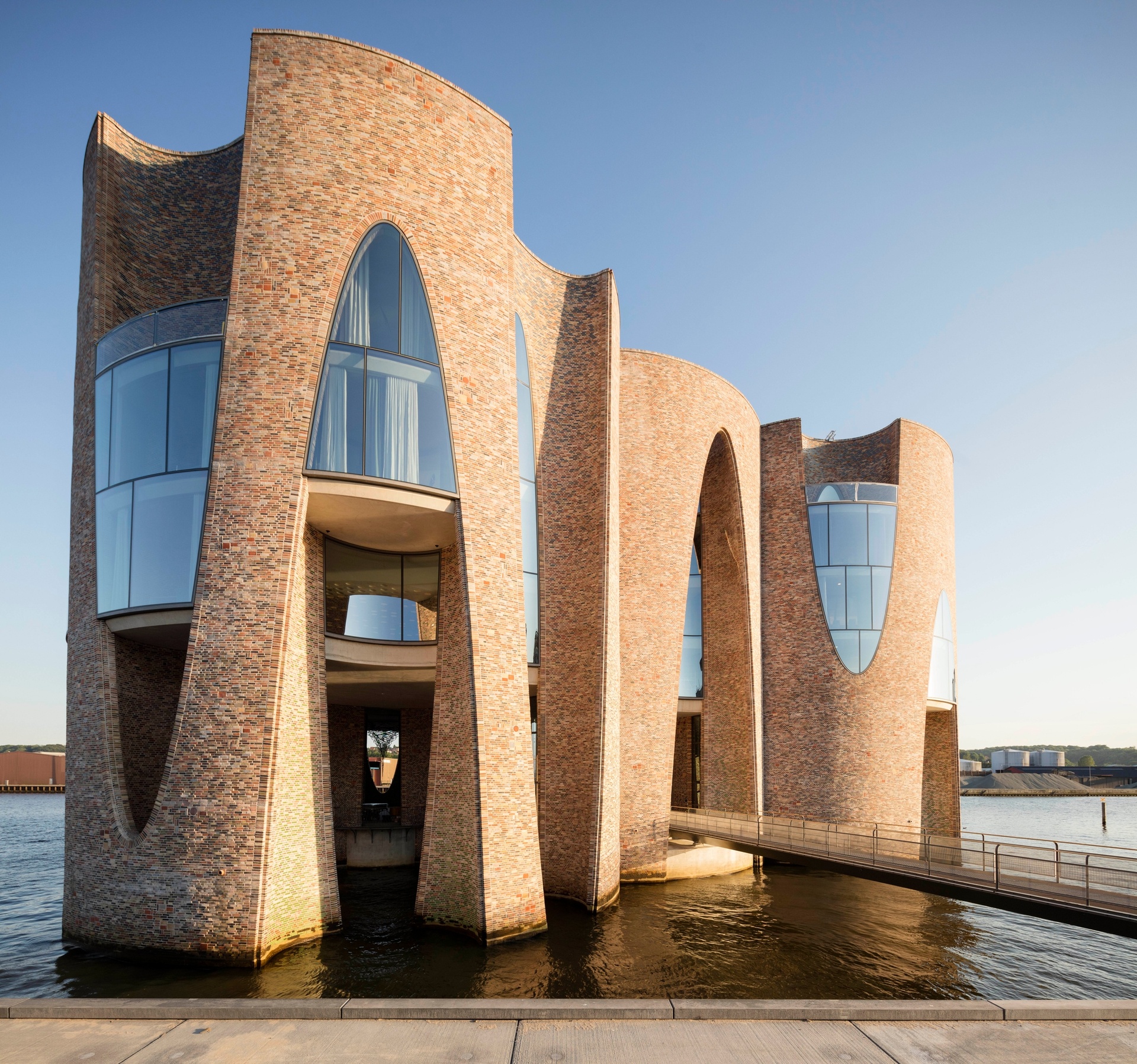 Fjordenhus (Fjord House), commissioned by KIRK KAPITAL, is the first building designed by Olafur Eliasson and Sebastian Behmann with Studio Olafur Eliasson. Rising out of the water, Fjordenhus connects Vejle Fjord with the city centre of Vejle. Accessible by footbridge, the twenty-eight-metre-high building is formed by four intersecting cylinders with brick facades from which ellipsoidal negative spaces were removed to create complex curved forms and arched windows. The varying floor plans of the different levels are organised around circles and ellipses, with specially designed furniture and lights connected by spiral staircases and round vestibules. The double-height ground floor, which is open to the public, is permeated by the fjord and contains two aqueous zones with site-specific artworks. By night, Fjordenhus is lit from within, resembling a lighthouse.